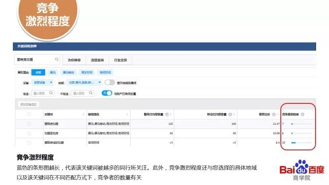 这里给大家举了四个关于给关键词出价可参考的因素: 1、竞争激烈程度 2、预期排名目标 3、预算承受范围 4、转化成本 01 这里说的是关于关键词的激烈竞争程度,在后台的关键词规划师工具中可以看到此项内容,蓝条越长、数字越大代表竞争激烈程度越高。如果我们选取的关键词竞争激烈程度较高也说明同行对这个词的关注度也就越高,对于这个词同行竞争比较激烈,企业需要考虑在保证出价的合理性同时可以达到比较好的转化效果。 02 预期排名越靠前预估的出价也相对来说会高一些,因为排名越靠前竞争越激烈,企业需要付出的成本也就越高。对于pc端和移动端来说,首页的位置都是比较好的,PC端的左侧和移动端的上方竞争更加激烈,用户关注度也比较高,企业根据可以自己的业务选择合理的关键词去竞争较优位置的排名。 03 如果一个关键词通过观察竞争激烈程度和企业的预期排名决定出价在30元左右比较合适,这时也要综合推广预算来合理分配价格,如果一天的预算是1000元,那此关键词可以出到30元,在预算充足的情况下该词有充足的展现机会;但如果企业预算只有100元的话,就要适当调整价格,保证推广的关键词可以有较充足的展现。 04 转化成本与消费和转化量相关,转化量恒定的情况下,消费越高转化成本越高。如果企业对于转化成本控制的比较严格的话,在关键词出价的时候也要合理考虑对消费的影响。 以上四点参考因素,在企业为关键词制定出价的时候,可以进行综合考量,合理给关键词进行出价。