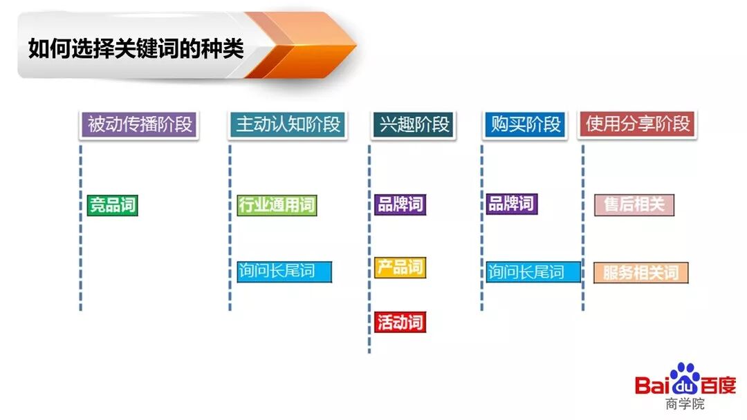 网民在不同的阶段需求不同,体现出来的搜索词也会不同,所以企业需要配置不同类型的关键词来满足网民在不同阶段的需求: