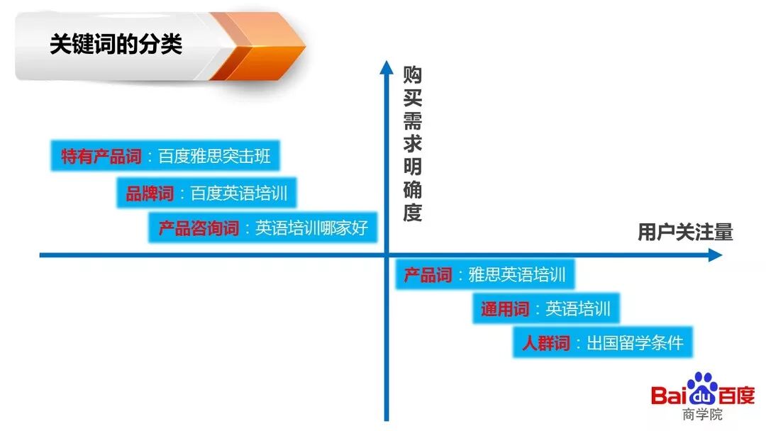 关键词大致可以分为:人群词、通用词、产品词、产品咨询词、品牌词和特有产品词。以英语培训行业为例: