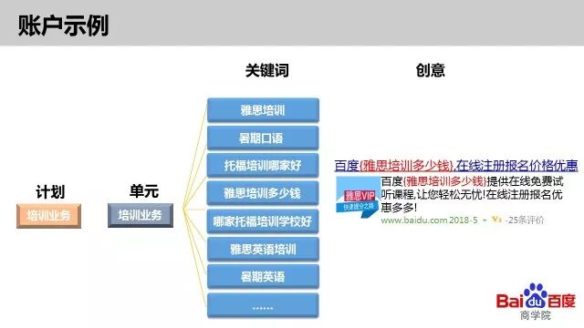 单元的作用就是帮助我们更细致的管理关键词,我们可以按词义、词性等维度分类关键词,方便写创意。这样才能让关键词和创意发挥他最大的作用。关键词是锁定我们的目标客户,创意是用来吸引网民的点击。只有健康的账户结构才能将对的信息传递给对的人。