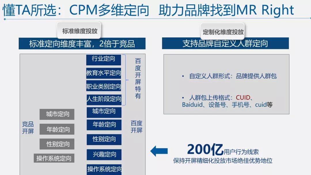 百度可以通过拓展这种相似人群进行广告的投放,那所有这些定向都是助力我们的品牌,找到我们最精准的目标用户的一个主要的方式。大家也可以看到我们CPM的定向有多么细。