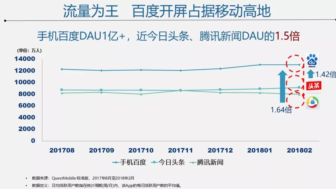 第三个没有任何的竞品的干扰。所以这就是我们开屏广告的一个主要的优势。那从第三个方面,也就是说为什么我们选择百度开屏?那从我们到2018年2月份所研究的数据来看,我们百度手机用户的日均的流量已经高达1亿以上。目前就今日头条以及腾讯新闻来说,我们的日均的流量是这两者的1.5倍。那从流量上来说,百度的开平市占据了一个移动端流量的最高点,我相信这也是百度开平一个非常大的优势,也是企业主选择我们的主要原因。
