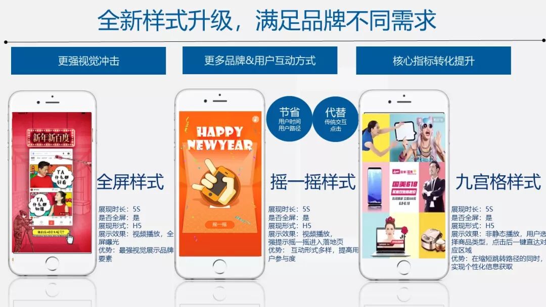 那接下来呢就与大家共同看一下,2018年百度开屏有哪些全新的展望?我们有一个全新样式上的升级,我们开除了开屏样式的话,还更新了摇一摇样式以及九宫格样式,那这种样式呢都特别适合于我们的。