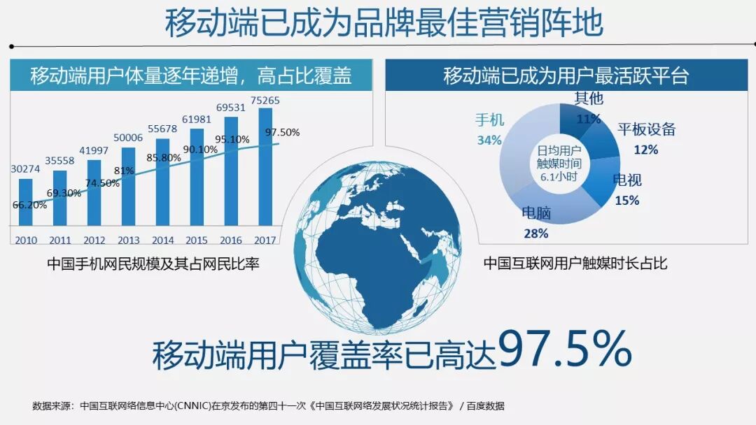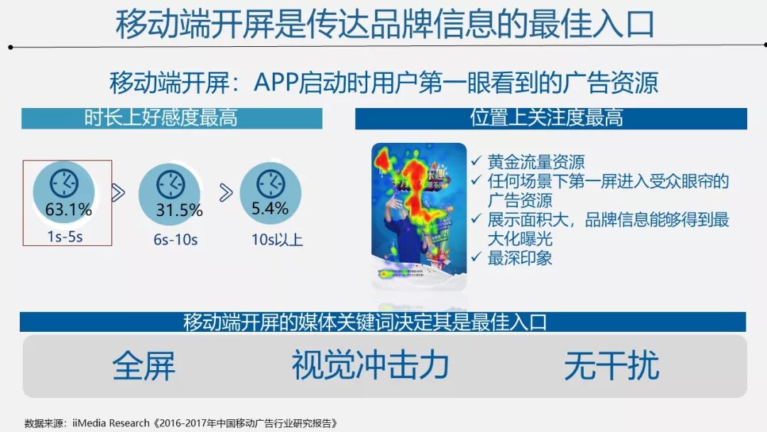 首先从移动端流量上来说,我们通过2010年到2017年的数据来看,中国手机网民的规模在持续攀升,那到现在为止,移动端用户的覆盖率已经高达了97.5%。同时呢移动端的用户触媒时长现在也是占到了34%。我们的日均用户出门时间到了六个小时以上,所以通过这方面来说,移动端已经成为了一个品牌最佳的营销阵地。那从第二个方面来说,我们来看一下为什么要去做开屏广告?首先从开屏广告的定义来说,开屏广告就是APP启动时用户第一眼所看到的广告资源。那从市场上来说,大部分在1.1到5秒的时候,我们有63.1%的用户是对以上广告充满好感的。