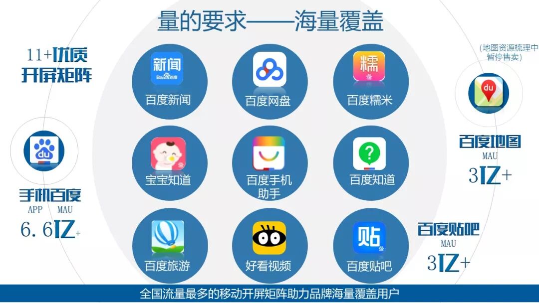 首先我们有量的要求,我们从大家可以通过这个宏观的图就能看到出有手机百度为首,百度地图百度贴吧这些APP矩阵来说的话,我们有11家优质的开屏矩阵,而且这些矩阵中各大APP资源每天的流量已经高达了几亿以上。那现在来说的话,它已经覆盖了全国流量最多的移动APP矩阵,而且这些矩阵将会助力我们的品牌的客户,去进行用户人群的覆盖。