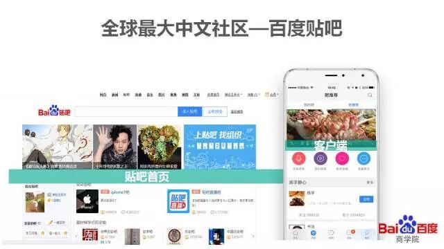 本节课主要从三个大方面来给大家介绍下百度贴吧这款产品:百度贴吧的背景情况、贴吧的优质资源、贴吧的案例。 百度贴吧背景 百度贴吧,是百度旗下独立的品牌,全球最大的中文社区。结合搜索引擎建立一个在线的交流平台,让那些对同一个话题感兴趣的人们聚集在一起,方便地展开交流和互相帮助。贴吧实际是一种基于关键词的主题交流社区,它与搜索紧密结合,准确把握用户的需求,为兴趣而生。