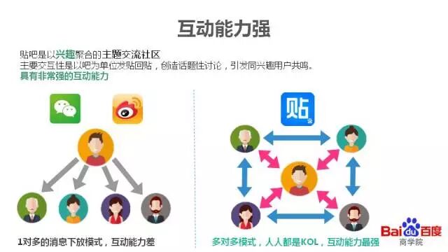 贴吧为什么互动能力这么强呢,我们来看下,主要交互性是以吧为单位发贴回贴,创造话题性讨论,引发同兴趣用户共鸣。具有非常强的互动能力,它不同于微博、微信强调社会关系及人际关系,贴吧以无数个兴趣做为纽带组件起来的圈子,采用多对多的模式,人人都是传播者,互动能力最强。这种强互动性所带来的高用户活跃度,使百度贴吧在众多垂类领域迸发出许多优质内容。