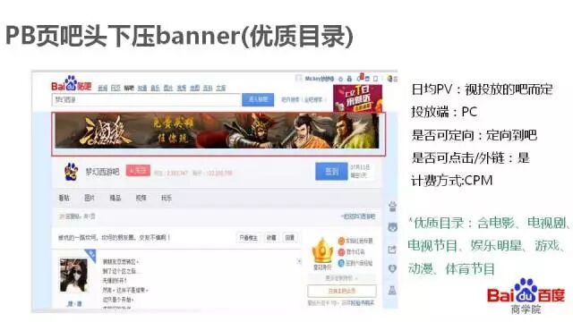 第4种形式是PB页吧头下压banner,首先我们说的PB页吧是指各个吧帖的独家图片集,下面这个案例呢就是三国杀在梦幻西游的把里面进行日曝光量要根据你投放的吧而定,投放端也是在PC端,可以定向到吧来投放,可以点击也可以外链,计费方式是CPM。