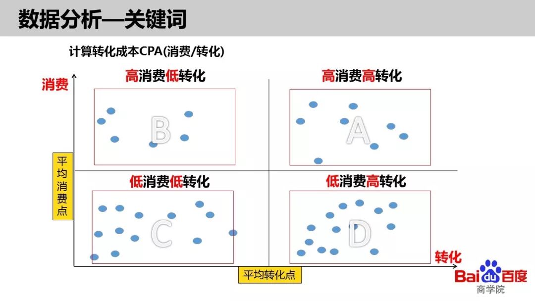 作为企业都知道关键词是帮助我们锁定目标客户的,不同类型的关键词带来的流量不同,效果也会不同,在我们的账户里有些词会有比较好的效果,有些词可能光消费不带来转化,这也是让我们企业主头疼的问题,那关键词要怎么优化呢?这堂课给大家带来的内容是关键词的优化方法。 01 关键词的分类 为了方便我们后期对关键词的分析,我们先把关键词进行一个分类,关键词可以分为4种不同类型的词。横坐标代表的是转化,纵坐标代表的是消费。 A象限:高消费,高转化 B象限:高消费,低转化 C象限:低消费,低转化 D象限:低消费,高转化 02 数据分析-关键词优化 A象限:高消费,高转化 A象限优化方法: 1.否定关键词:针对于高消费的词是不是有不相关词过来,如果有不相关的词,我们可以添加否定关键词。帮助我们节省推广的费用。 2.关键词匹配模式:不同的匹配模式带来的流量是不一样的,看看消费高是不是设置的匹配模式过于宽泛。 3.拓展业务相关词:我们可以找些转化高的词,在这些转化高的词的基础上我们可以多去拓展一些相关的词,增加转化。 B象限是高消费,低转化 对于这类的词,我们要从3个方面去优化:一、百度推广阶段 二、网站阶段 三、我们的销售阶段。 一、百度推广阶段: 1.否定关键词:看下是不是有不相关的过来,不相关进行否定关键词的设置,避免没有必要的点击造成消费。 2.替换为业务针对性更强的词:我们的选词要有针对性,选业务词,比如在你的账户中可以多一些产品词,产品咨询词等。 3.创意突出业务范围:看下创意,标题的内容,还有创意的内容,是不是都是围绕着关键词进行攥写。 二、网站阶段: 1.优化网站质量:我们要看网站整体的一个质量,比如网站的打开速度是不是够快,例如说网民到达了我的网站了,但是我的网站打开速度是30s,那可能网民就直接走掉了,我们要去关注网站的打开速度。 2.提高网页相关性:网站的内容是不是有吸引力,当网民进到你的网站,如果没有他想看的内容,或者没有找到相关的内容他也会选择离开。 三、销售阶段: 1.销售工具布置:有没有交流咨询转化的工具可以辅助。 2.销售人员经验及技巧:我们网站里面,有客服在线,但咨询了之后呢,没有人说话,网民也有可能走掉,这些地方也是我们需要注意的。 C象限低消费低转化 对这类词,我们可以放量测试: 1.保证排名:首先来看下我们的排名是不是不够靠前,排名不好,网民看不到。 2.优化创意增加点击:我们的创意是不是没有吸引力。 3.优化网站质量:保证网站的打开速度,网站吸引力及页面的相关性。 4.提高网页相关性:页面的打开速度太慢了,是不是网页设置不太好,或者网民点击广告的落地页面设置的不相关,我们要提高页面的相关性。 D象限低消费高转化 D象限需要更多的资源支持: 1.给予更多资源:可以给予这些词更多的资源延长推广时间、增加预算等。 2.增加同类词:添加这类词的同类词,挖掘新词,开发出效果更好的词。